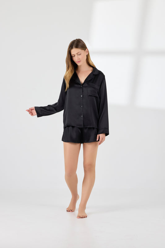 Buttery silk meets timeless design in this classic pajama set, featuring a relaxed top and wide-leg pants for a chic, relaxed feel.
